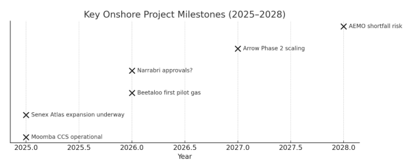 By 2026, Beetaloo Basin will deliver its first pilot gas. By 2027–2028, Arrow Energy’s Phase 2 will be driving drilling and compression activity. By 2030, carbon capture and storage will be mainstream, with Moomba operating at full capacity and new CCS initiatives underway in Queensland and the NT.